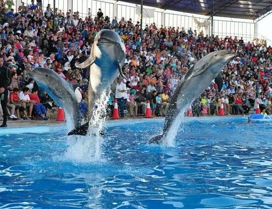 В дельфинарии проходят шоу дельфинов эти умные и дружелюбные животных,ежедневно.